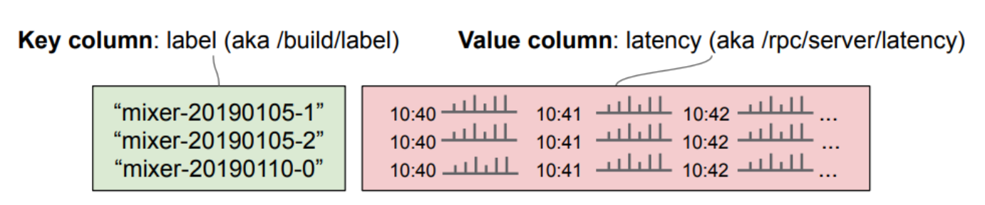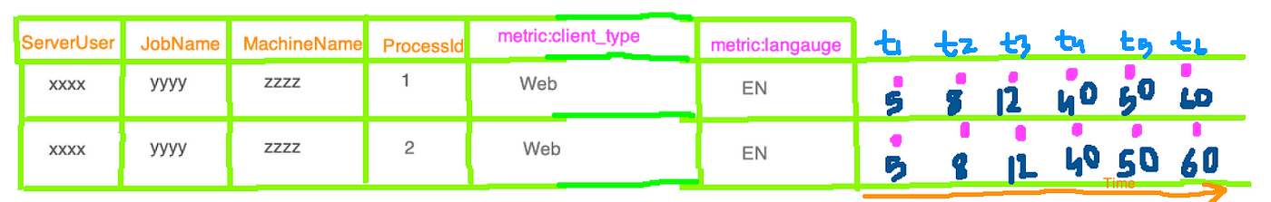 모든 메트릭은 자체 테이블에 저장됩니다. 각 행은 서버 메타데이터와 메트릭 태그의 특정 조합에 대한 데이터 스트림입니다.